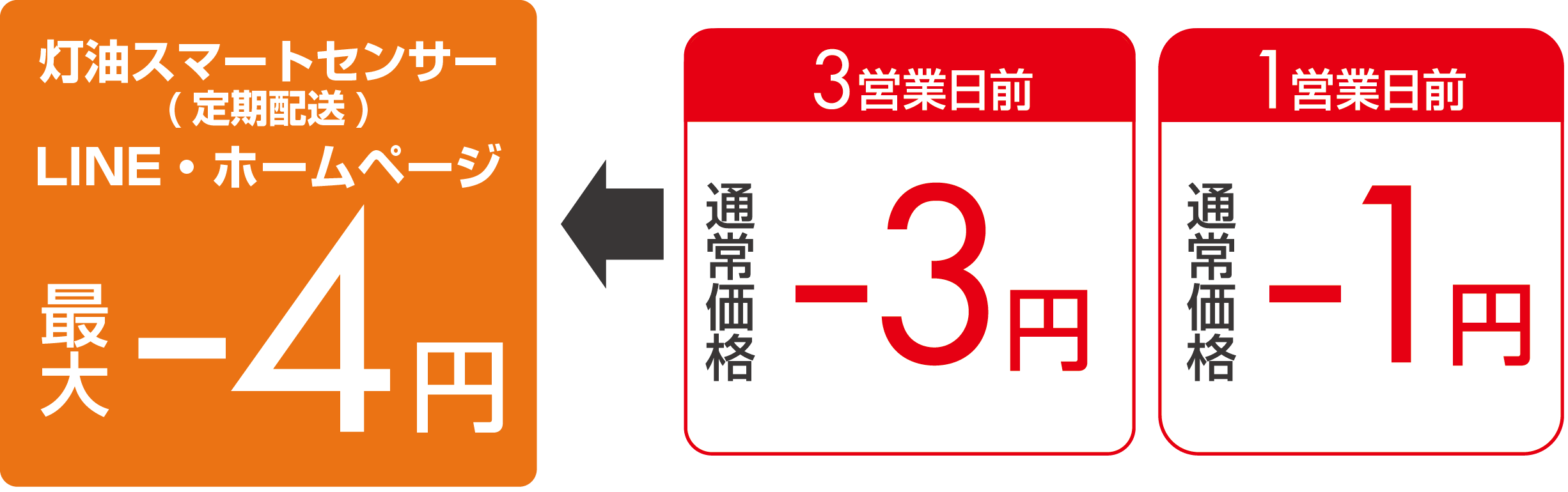 3営業日以内での配達となり、通常価格より3円引き/ℓとなります。