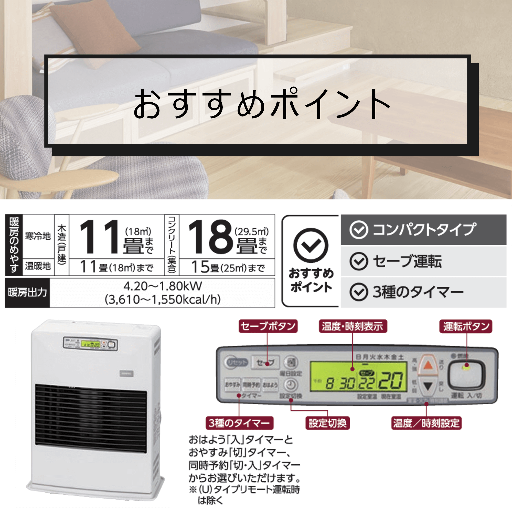 ぬくもりがすばやくお部屋に広がる、ガスFF温風ストーブ。コンパクトタイプなので、設置場所に困りません。3種のタイマー搭載で、消し忘れの防止にも。