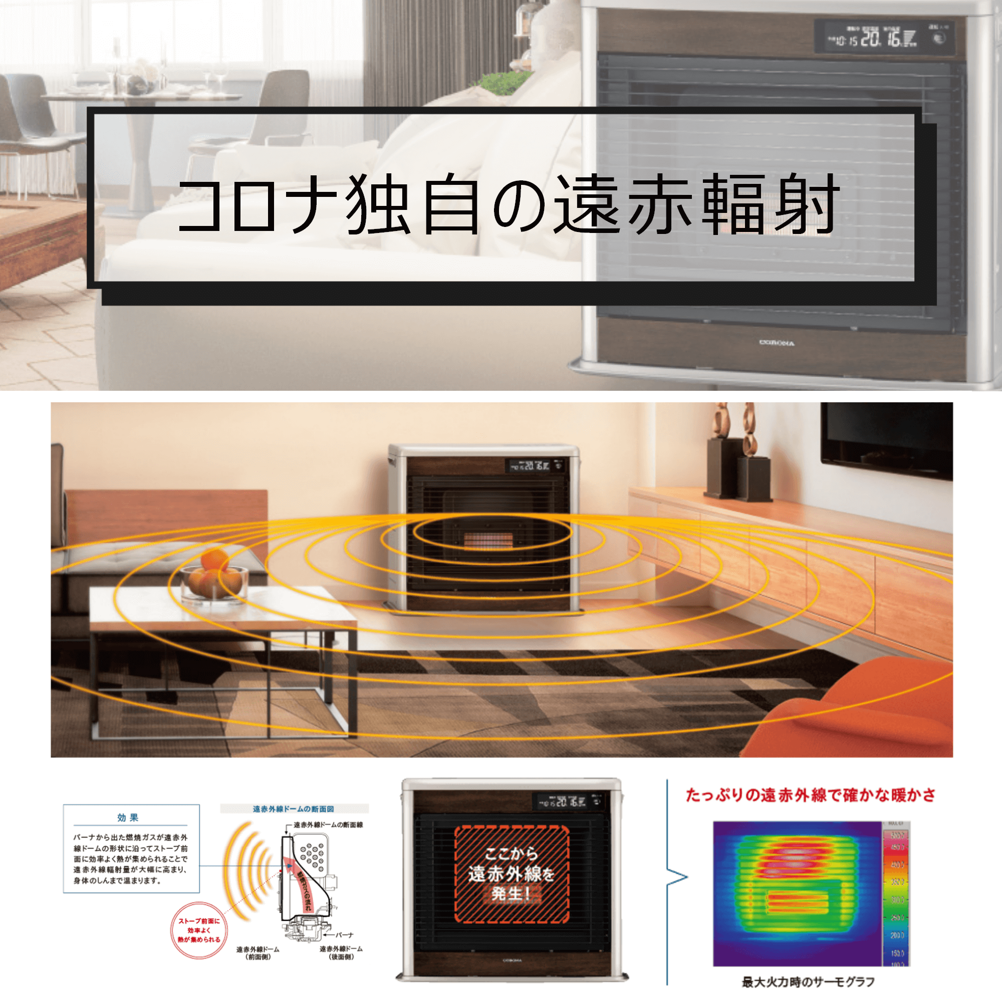 コロナ独自の遠赤外線輻射+微温風で身体のしんまで温まります。遠赤外線ドームでバーナを覆う独自の遠赤燃焼テクノロジー搭載で、大きな輻射パネルからたっぷりの遠赤外線を輻射します。