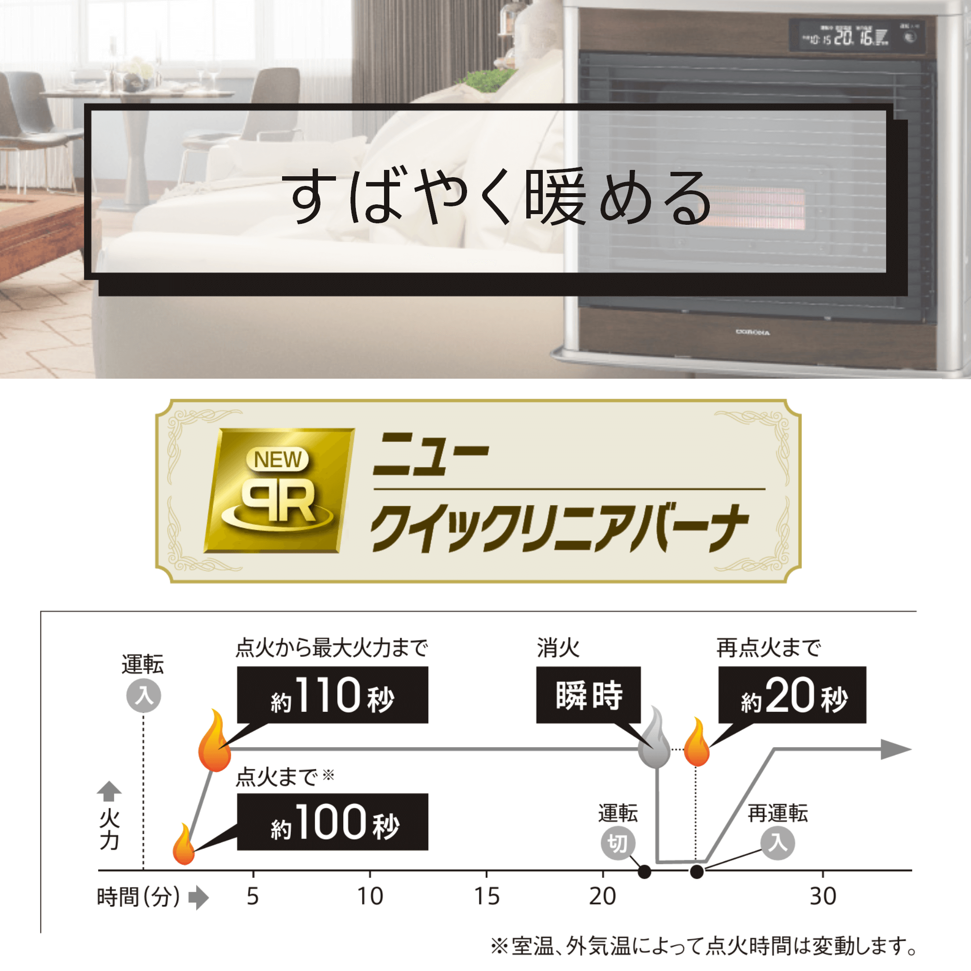 石油ガス化、ニュークイックリニアバーナの採用により、点火・消火・再点火が速いハイスピード&クリーンな燃焼を実現しました。寒い朝でも、帰宅後すぐでも、すばやく暖めます。