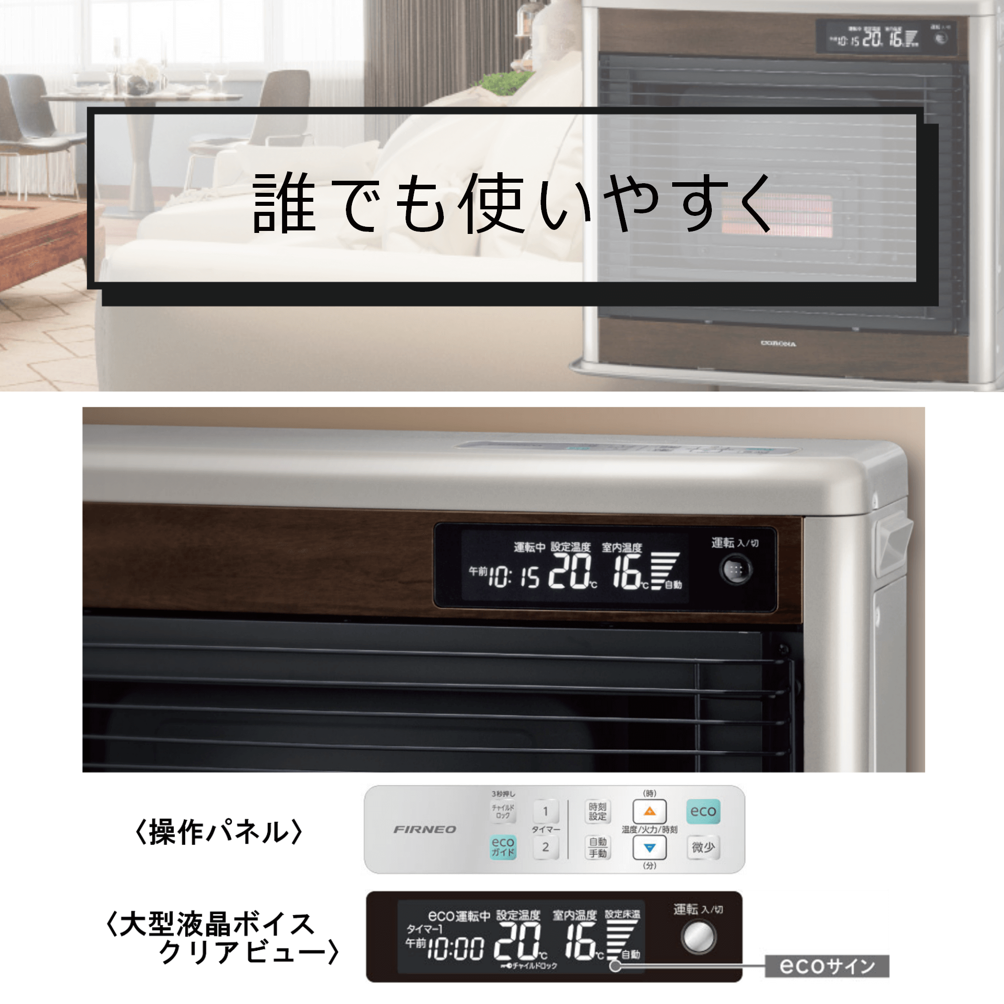 画面が大きくて見やすいし、操作も簡単で声で応えてくれるので安心です。ECO運転で灯油の消費も抑えられて家計に大助かりです。想像していたよりも暖かくてとても満足です。