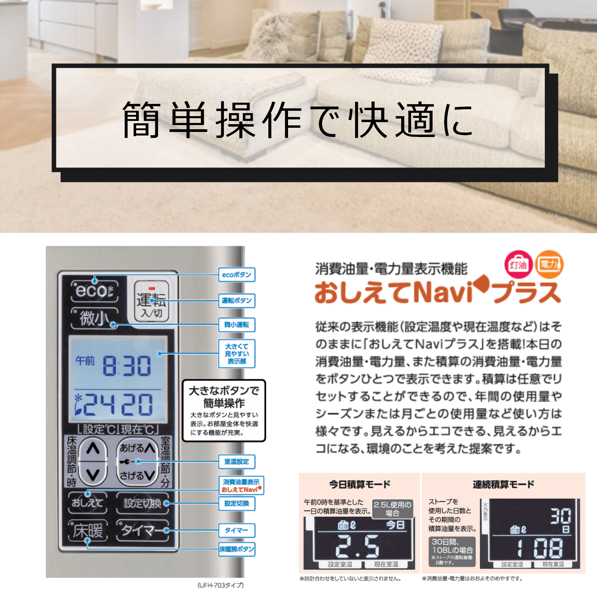 大きなボタンと見やすい表示で、お部屋全体を快適にする機能が充実。おしえてNaviプラス搭載で消費油量や電力量がボタンひとつで見えるのでエコになります。