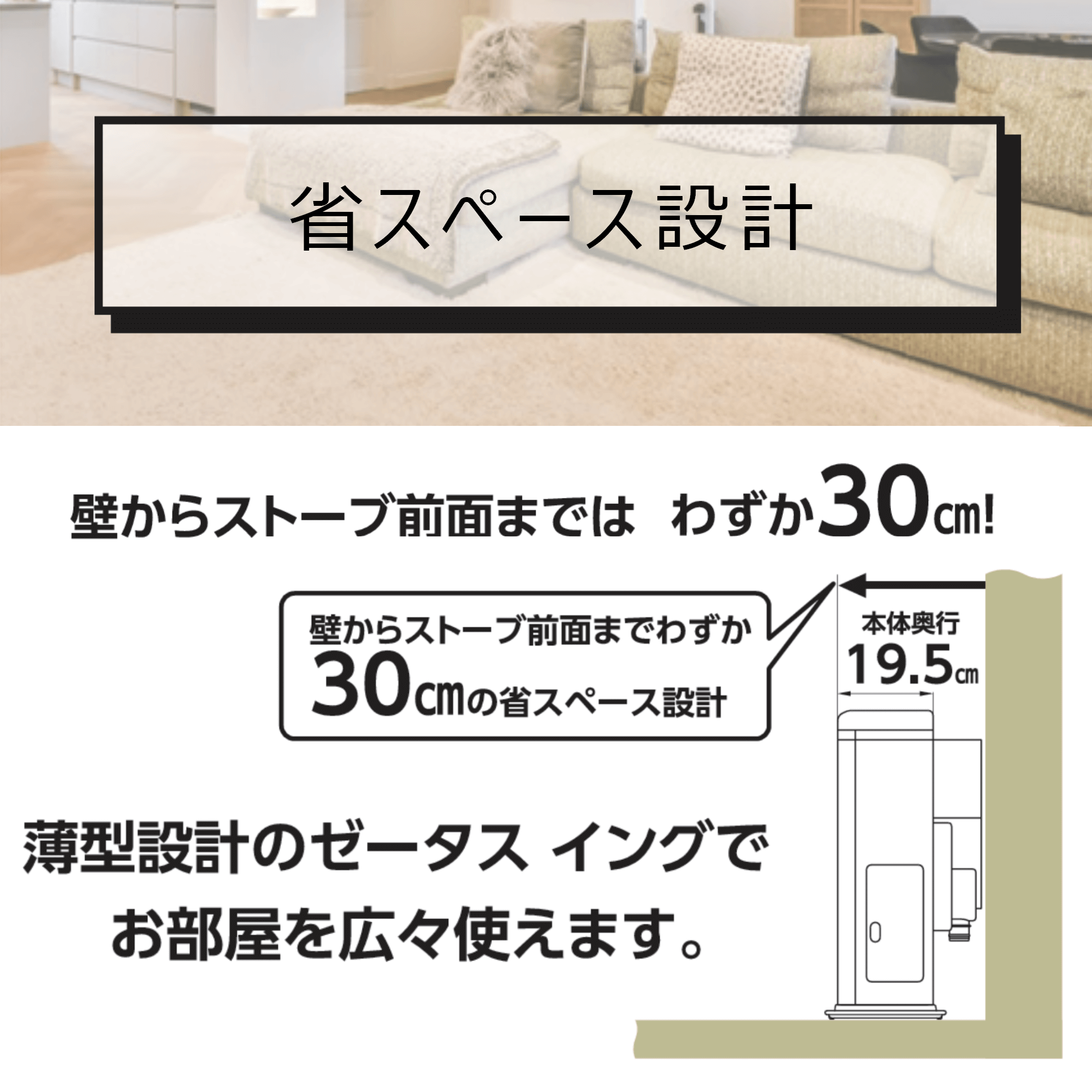 FFR-703SXは、本体の奥行19.5cm。壁からストーブ全面まで、わずか30cmとSUNPOTブランドのストーブの中でもバツグンの省スペース設計。お部屋を広々使え、快適な暖房空間を実現します。