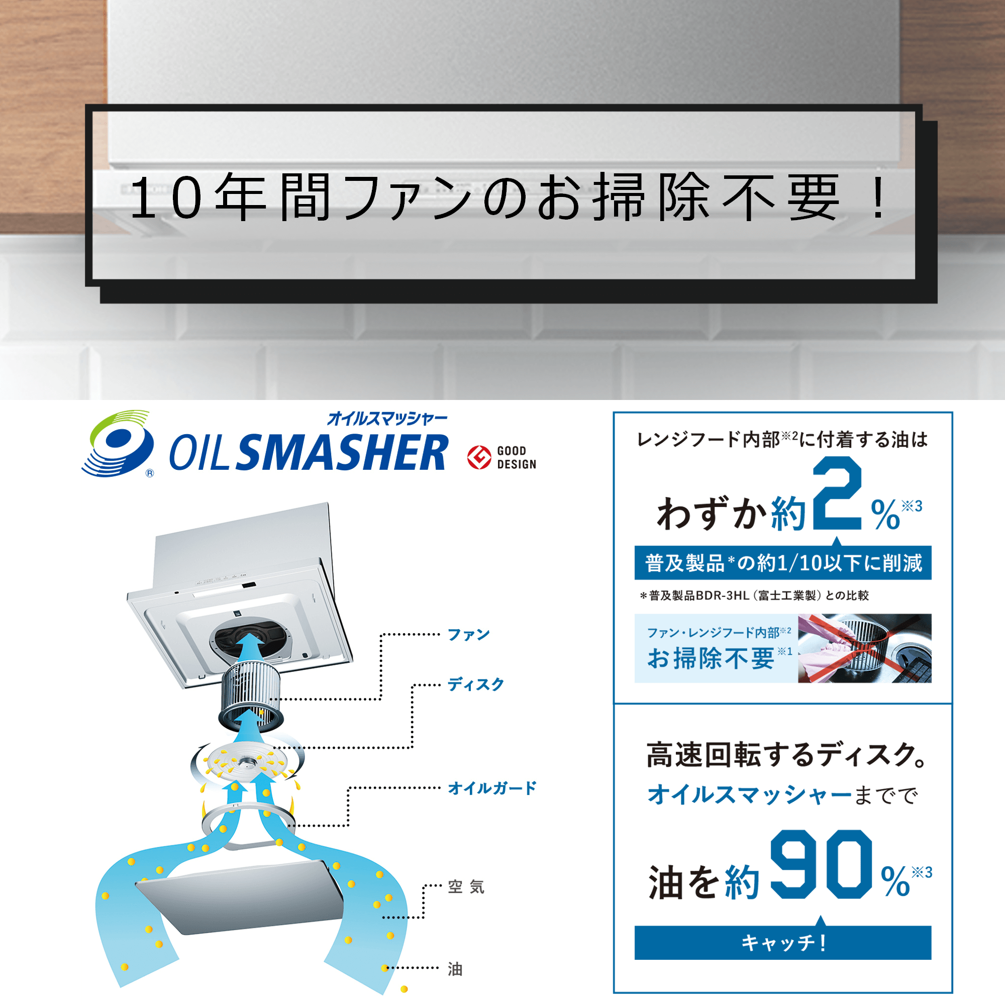 オイルスマッシャーにより、ファンとレンジフード内部への油の侵入をブロック。10年間ファンのお掃除が不要になります!