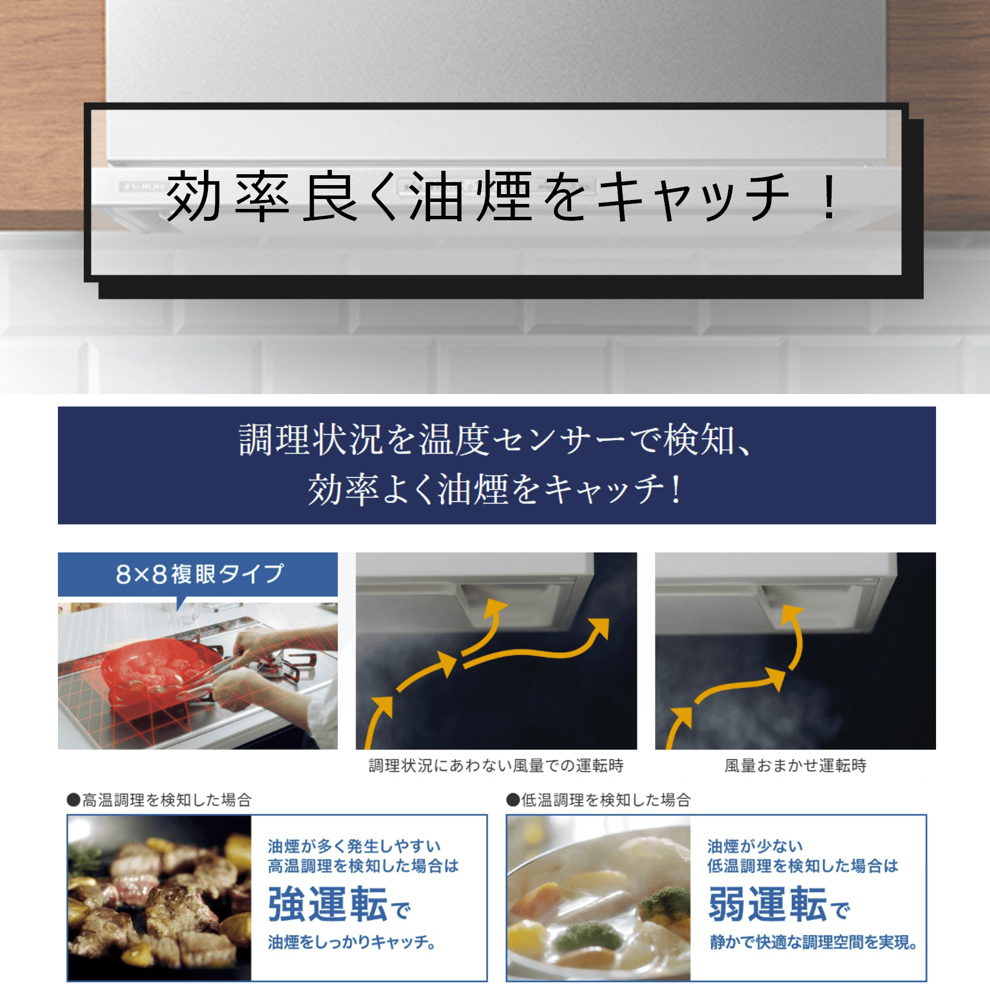 「風量おまかせ運転」で、調理状況に応じて風量を自動でコントロール。温度センサーが検知し、快適な調理空間を実現します。必要以上に風量を上げないので、消費電力も削減します。