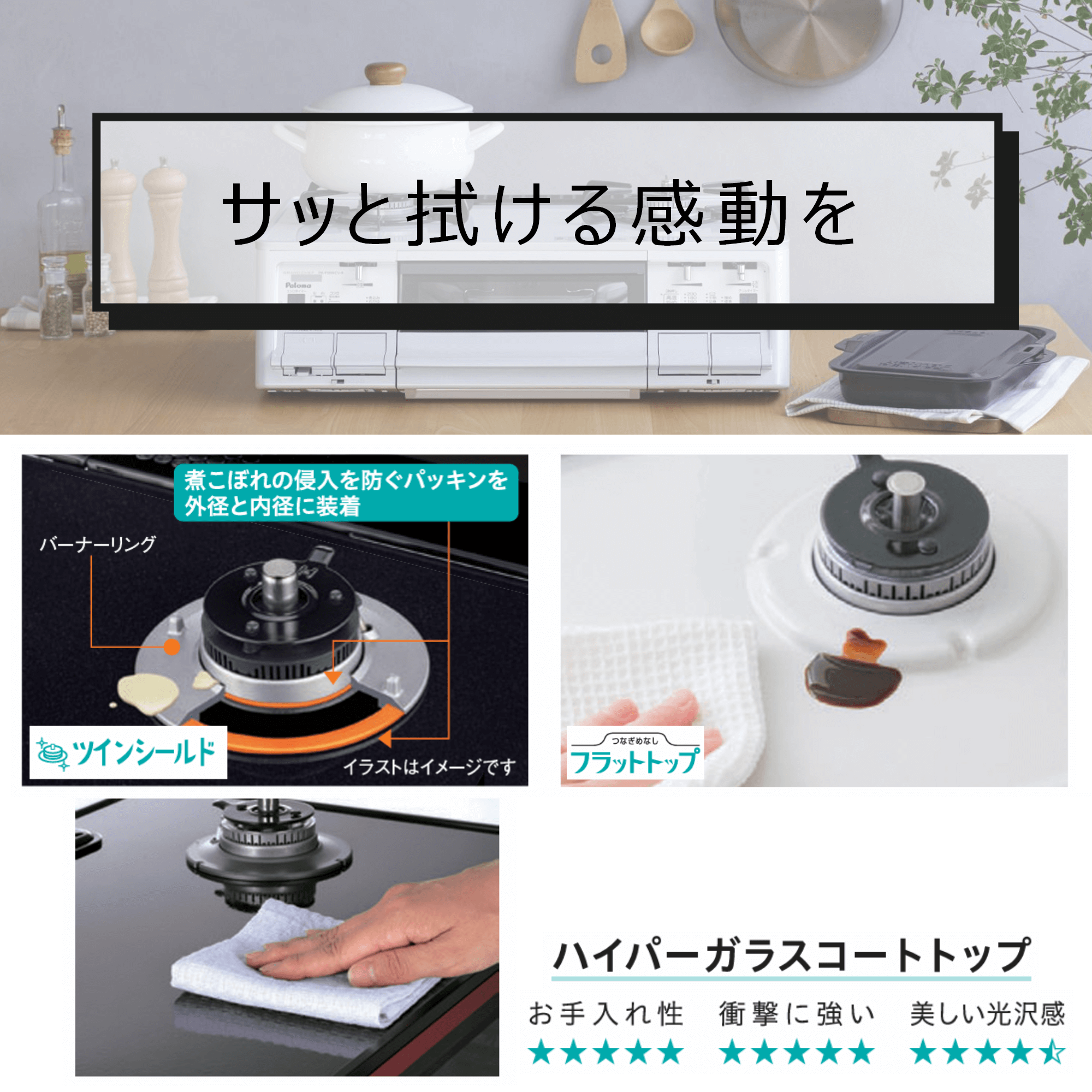 バーナーリングにパッキンを装着したツインシールド構造で煮こぼれによる器具内部への侵入を防ぎます。ハイパーガラストップを採用し、お手入れも簡単にできます。