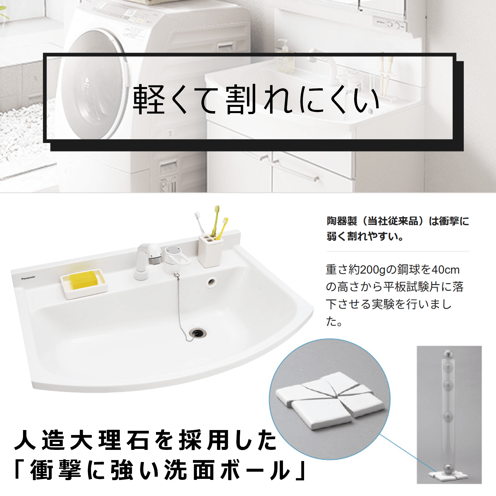 人造大理石を採用した「衝撃に強い洗面ボール」。洗面ボール部は、陶器製の約1/5(当社従来品比)の重さなので、搬入&施工がラク。