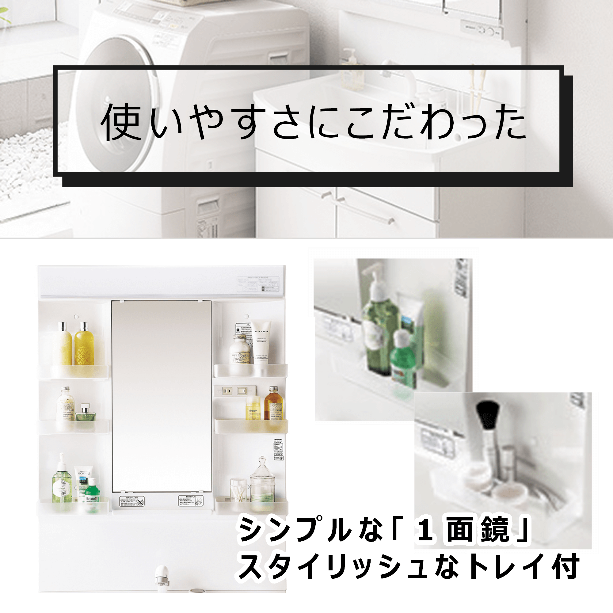 使いやすさにこだわったシンプルな「1面鏡」。化粧小物などが置けるスタイリッシュなトレイ付。