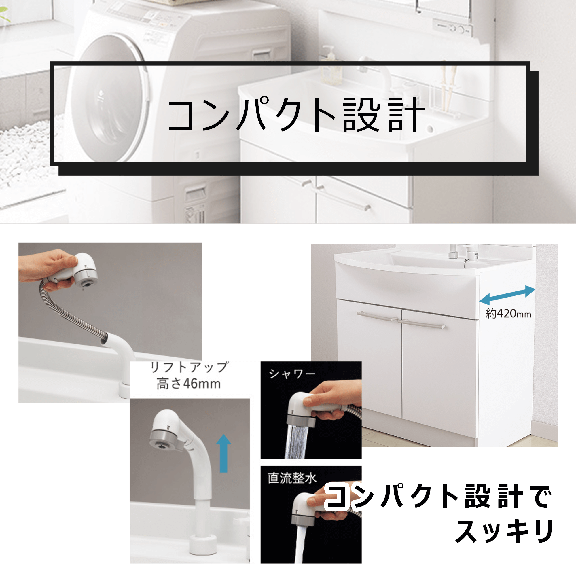 水はねしにくい「水栓」を採用。シャワーと整水の切り替えが可能です。ホルダーがリフトアップするので両手でシャワーする時に便利です。また、奥行き約420mmのコンパクト設計のキャビネットで壁にスッキリと納まります。